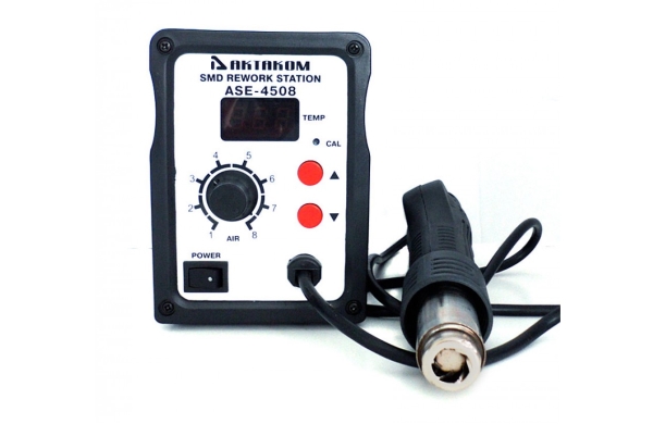 Термовоздушная паяльная станция мощностью 700 Вт, цифровая индикация, температурный диапазон 100...450 °С, воздушный поток 120 л/мин (макс), низкошумящий безщеточный вентилятор. Широкая номенклатура сменных наконечников. Габариты: 151×100×153 мм. Вес: 1,5 кг.