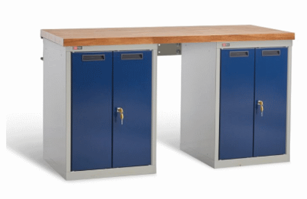 Металлические элементы верстаков окрашены эпоксидной порошковой краской, устойчивой к механическим воздействиям и агрессивным жидкостям. Ящики, дверцы тумб и стойки экрана – цвет темно-синий RAL 250 20 20, остальные элементы – цвет серый RAL 7038.
