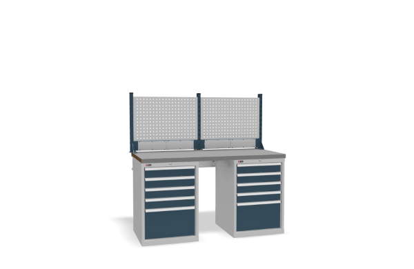 Металлические элементы верстаков окрашены эпоксидной порошковой краской, устойчивой к механическим воздействиям и агрессивным жидкостям. Ящики, дверцы тумб и стойки экрана – цвет темно-синий RAL 250 20 20, остальные элементы – цвет серый RAL 7038.